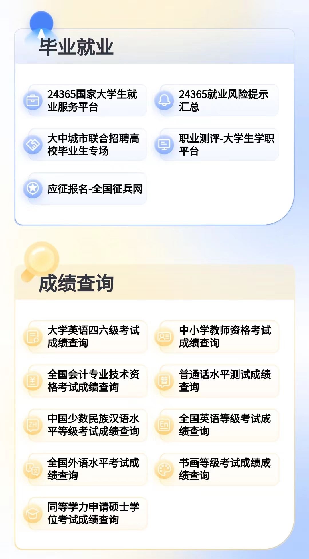 細分到大學(xué)生群體,“人民網(wǎng)+”客戶端便民服務(wù)匯總小程序提供在校期間多種國家考試成績的查詢服務(wù),并為大學(xué)生群體提供畢業(yè)就業(yè)資訊及服務(wù),實現(xiàn)從入學(xué)到就業(yè)“服務(wù)閉環(huán)”: