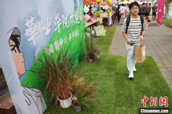 新生從展示的草皮上走過,該草種為南京農(nóng)業(yè)大學(xué)草坪科學(xué)與管理團隊自主培育的藍(lán)光中華結(jié)縷草,葉寬中等,葉色藍(lán)綠,觀賞度高,且耐踐踏,抗旱性強,抗病蟲能力強。泱波 攝