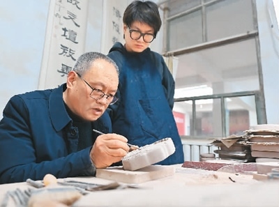 絳州澄泥硯制作技藝省級代表性傳承人藺濤(左)指導(dǎo)兒子藺霄鱗處理澄泥硯雕刻的細(xì)節(jié)。