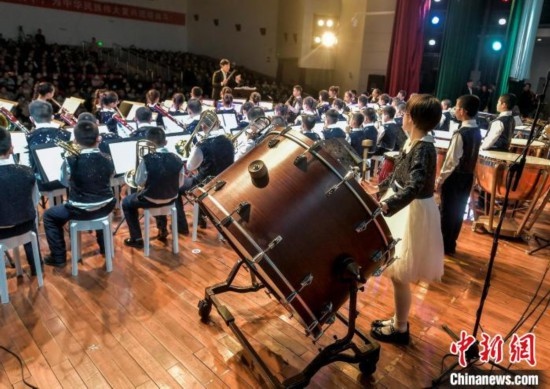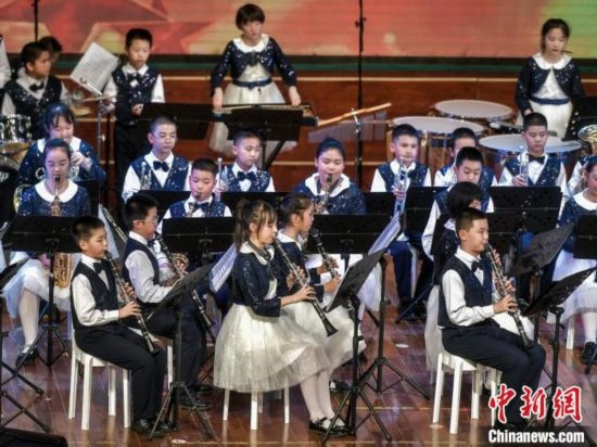 烏魯木齊市第27小學(xué)交響管樂團(tuán)登臺(tái)獻(xiàn)藝。中新網(wǎng)記者 劉新 攝