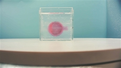 “嗡嗡嗡……”30厘米見方的操作臺上,一根3D打印針頭扎進透明“果凍”中,針口處不斷擠出一根“紅線”,在“果凍”中沿著電腦規(guī)劃好的路線來回移動“作畫”。當針頭自下而上移動到“果凍”上端時,只要按下暫停鍵,再將一層新“果凍”疊加到舊“果凍”上面,針頭又開始“畫”起來。最終,一顆高約6.5厘米的紅色心形3D模型被僅有1.27厘米長的小針頭精準打印出來。