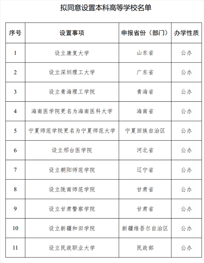 人民網(wǎng)北京5月15日電 (記者李依環(huán))教育部網(wǎng)站今天發(fā)布消息,根據(jù)高等教育法、《普通高等學(xué)校設(shè)置暫行條例》等有關(guān)規(guī)定以及第八屆全國高等學(xué)校設(shè)置評議委員會考察評議結(jié)果,經(jīng)教育部黨組會議審議,擬同意設(shè)置康復(fù)大學(xué)等24所學(xué)校。其中,2所高校更名,21所高校為新設(shè)、1所高校為轉(zhuǎn)設(shè)。
