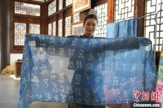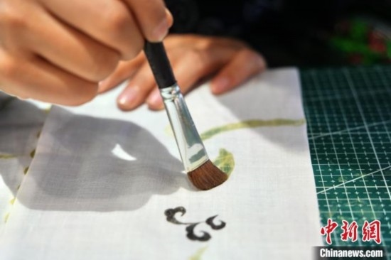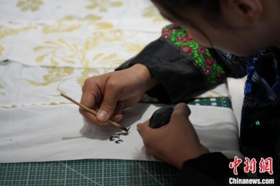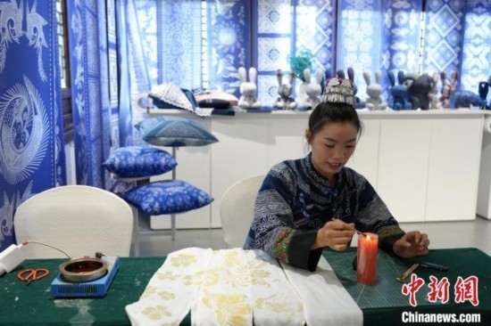 貴州織金苗族蠟染2021年6月入選國務(wù)院公布第五批國家級非物質(zhì)文化遺產(chǎn)代表性項目名錄?!?5后”苗族女孩王秋雨大學(xué)畢業(yè)后回到織金,成為一名織金苗族蠟染推廣者。她不僅使用傳統(tǒng)小臘刀,還使用大臘刀和毛筆,以蜂蠟為墨在絲巾、衣服、箱包上繪制小篆、甲骨文、山水等文字與圖案,這些蠟染產(chǎn)品深受消費者喜愛。圖為6月19日,王秋雨在織金縣平遠古鎮(zhèn)的依文織金數(shù)字化展廳制作蠟染。周燕玲 攝