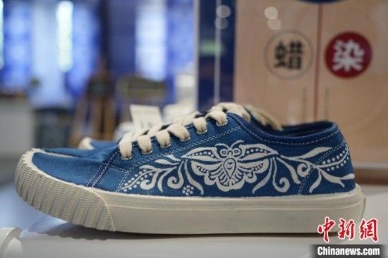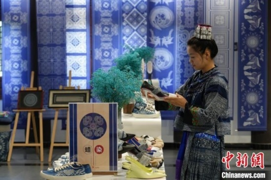 6月19日,織金縣平遠古鎮(zhèn)依文織金數(shù)字化展廳展示的蠟染帆布鞋。周燕玲 攝