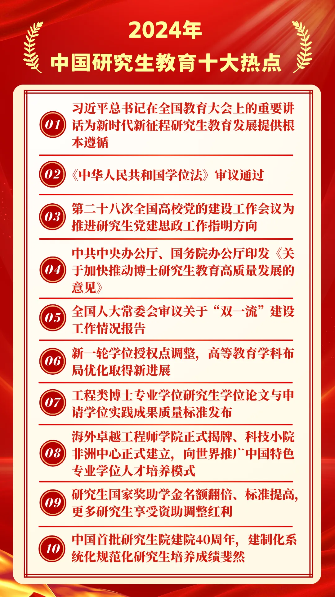 2024年,是中國學(xué)位與研究生教育發(fā)展史上具有重要里程碑意義的一年,在教育部學(xué)位管理與研究生教育司指導(dǎo)下,教育部學(xué)位與研究生教育發(fā)展中心《中國研究生》雜志回顧總結(jié)全年研究生教育大事要事和熱點(diǎn)動(dòng)態(tài),聯(lián)合人民網(wǎng)、新華網(wǎng)、中國教育報(bào)和有關(guān)研究生教育媒體等共同發(fā)布2024年中國研究生教育十大熱點(diǎn)。