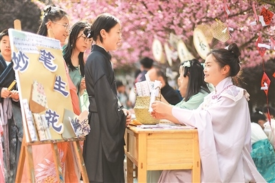 近年來,為更好地傳承詩(shī)歌文化,貴州省黔西市觀音洞鎮(zhèn)沙井小學(xué)每年春天都會(huì)舉辦校園詩(shī)歌文化節(jié)系列活動(dòng),老師帶領(lǐng)學(xué)生身著漢服寫詩(shī)歌,朗誦詩(shī)歌,猜詩(shī)歌謎語(yǔ)。圖為學(xué)生在向老師朗誦自己寫的詩(shī)歌。