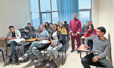 2021年,卡利布學(xué)成回到埃塞俄比亞,發(fā)現(xiàn)很多埃塞人有學(xué)習(xí)中文的需求,便開(kāi)辦了“你好”中文學(xué)校。針對(duì)當(dāng)?shù)厝说陌l(fā)音和學(xué)習(xí)習(xí)慣,開(kāi)發(fā)了阿姆哈拉語(yǔ)和中文雙語(yǔ)教材,在當(dāng)?shù)刂形慕逃I(lǐng)域獨(dú)樹(shù)一幟,吸引了上百名學(xué)員。這些學(xué)員不僅有即將赴中國(guó)留學(xué)的學(xué)生,還有與中國(guó)有生意往來(lái)的商人等。此外,卡利布教學(xué)內(nèi)容的一部分是教中國(guó)人學(xué)習(xí)阿姆哈拉語(yǔ),旨在幫助大家更好地融入當(dāng)?shù)厣睢?/p>