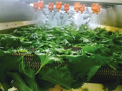 在紫蘇基地加工車間,20多名工人正在熱火朝天地忙碌著,采摘好的紫蘇葉在這里經(jīng)過清洗、精選、包裝等多道工序處理后,會按照不同品級進行精細化捆扎分類,然后被送入冷庫進行預冷,整個操作都是在無菌環(huán)境下進行?!艾F(xiàn)在臨時工、長期工加一起有20多人,5年來,我們在七圪臺村、什不斜氣村、什拉烏素村等周邊培訓了村民200人左右,他們每年農(nóng)閑時就會來基地打工,男工負責大棚管理、種植,女工負責采葉子、分葉子、包葉子?!卑合蛴浾呓榻B道。
