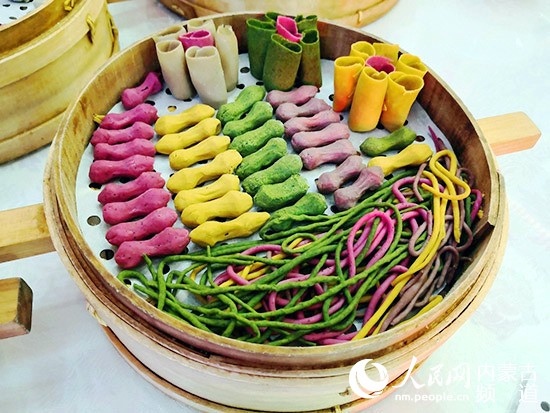經(jīng)過蒸、烙、炒等多道工序,莜面魚魚、莜面窩窩、莜面卷卷出鍋上籠,散發(fā)著幽幽燕麥清香?!皞鹘y(tǒng)手藝也要創(chuàng)新,”莜面師傅袁俊平把菠菜、火龍果、金瓜、紫薯榨成果蔬汁和在面里。“五彩莜面”不僅增加了莜面的色澤,食客在品嘗時也能體驗到不同果蔬的滋味。