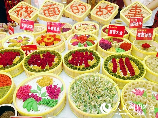 莜面師傅用五彩莜面拼寫“武川莜面甲天下”字樣。陳立庚攝