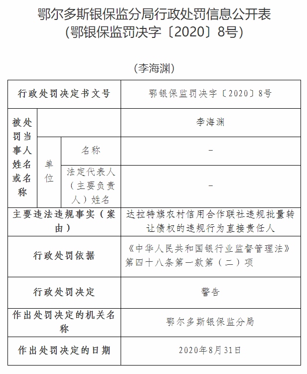 北疆新聞網(wǎng)、北疆新聞客戶端消息(記者 張楊)11月5日,銀保監(jiān)會官網(wǎng)通報達拉特旗農(nóng)村信用合作聯(lián)社違規(guī)批量轉(zhuǎn)讓債權(quán),被鄂爾多斯銀保監(jiān)分局依據(jù)《中華人民共和國銀行業(yè)監(jiān)督管理法》第四十六條第(五)項,處以罰款25萬元。其法定代表人李海淵作為達拉特旗農(nóng)村信用合作聯(lián)社違規(guī)批量轉(zhuǎn)讓債權(quán)的違規(guī)行為直接責(zé)任人,被鄂爾多斯銀保監(jiān)分局依據(jù)《中華人民共和國銀行業(yè)監(jiān)督管理法》第四十八條第一款第(二)項,處以警告處罰。
