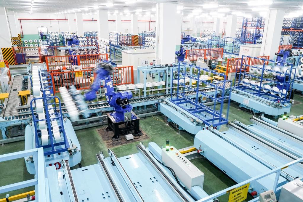位于江蘇省蘇州市吳江區(qū)盛澤鎮(zhèn)的一家智能車間,機器人在車間內(nèi)自動作業(yè)。新華社記者 李博 攝