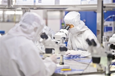 工人在包頭江馨微電機(jī)科技有限公司數(shù)字化百級無塵車間趕制配套5G手機(jī)產(chǎn)品的音圈馬達(dá)。