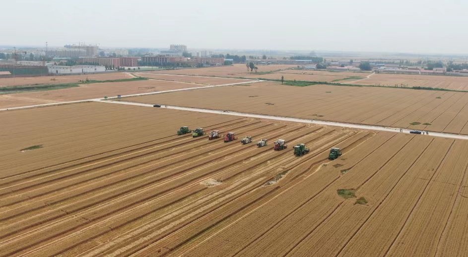 夏收時節(jié),在山東省德州市臨邑縣德平鎮(zhèn)大西關(guān)村的麥田里,幾臺收割機排成一排,轟隆隆地穿梭在金色的麥浪中。富民家庭農(nóng)場負(fù)責(zé)人魏德東指著剛收獲的小麥說:“畝產(chǎn)量將近1300斤,一畝地比往年增產(chǎn)了百十斤,不僅產(chǎn)量高,品質(zhì)也好?!?/p>