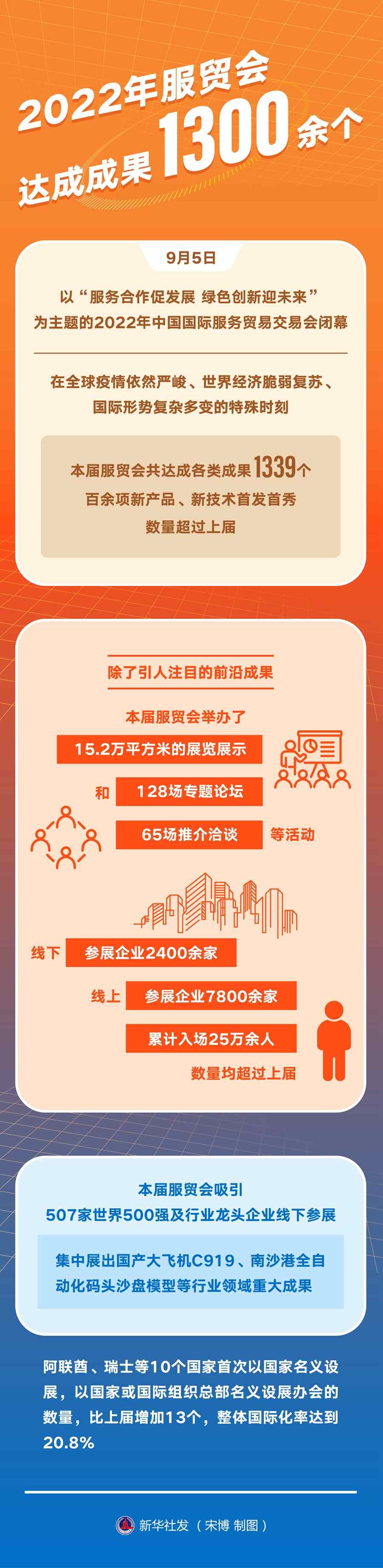 9月5日,以“服務合作促發(fā)展綠色創(chuàng)新迎未來”為主題的2022年中國國際服務貿易交易會閉幕。在全球疫情依然嚴峻、世界經濟脆弱復蘇、國際形勢復雜多變的特殊時刻,本屆服貿會共達成各類成果1339個,百余項新產品、新技術首發(fā)首秀,數量超過上屆。