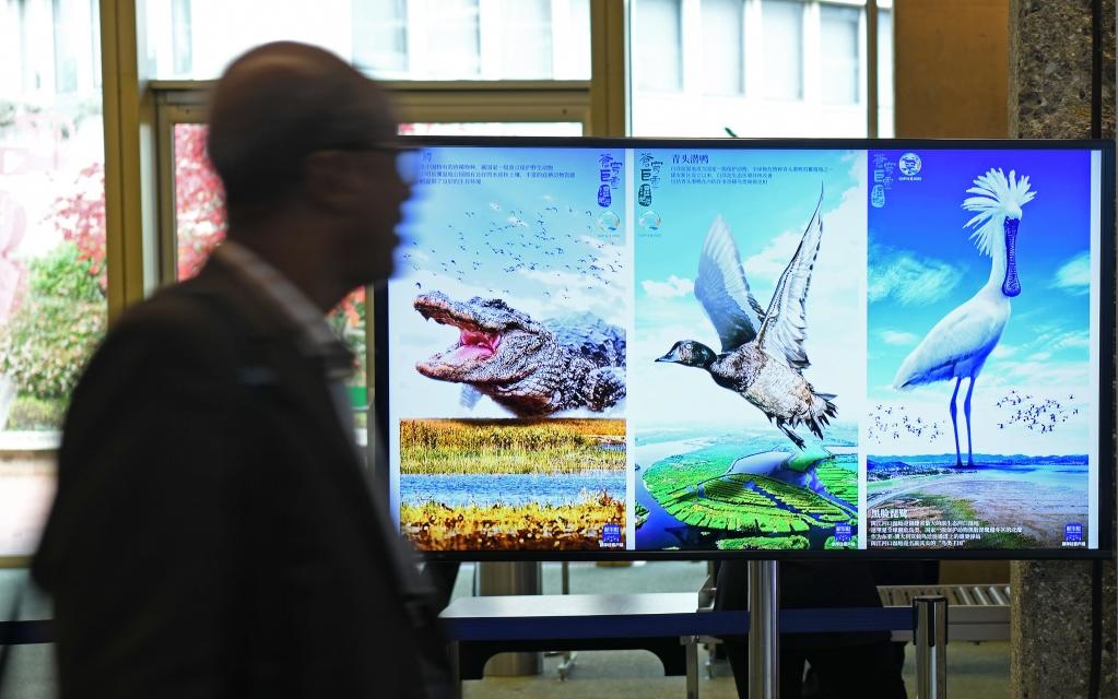 2022年11月5日,在瑞士日內瓦,與會嘉賓在《濕地公約》第十四屆締約方大會日內瓦會場中國展區(qū)參觀。新華社記者連漪攝