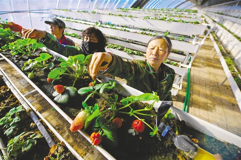 春節(jié)期間,蘇尼特右旗賽漢塔拉鎮(zhèn)扶貧產(chǎn)業(yè)園區(qū)的日光大棚里,菜農(nóng)們正在采摘立體種植的草莓。當?shù)攸h委政府引導居民整合土地建設日光溫室大棚,以“土地入股企業(yè)分紅”“承包大棚按企業(yè)要求種植”“務工就業(yè)”等方式實現(xiàn)增收致富。(記者 王曉博 攝)