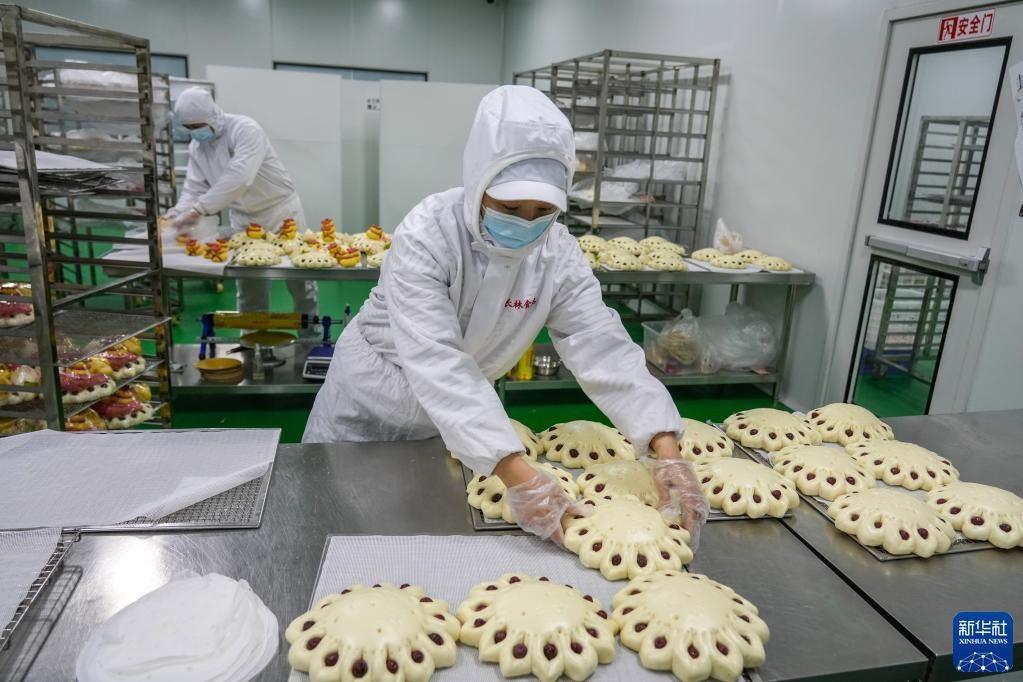 2月17日,威海長林生態(tài)農(nóng)業(yè)有限公司員工在十萬級凈化生產(chǎn)車間內(nèi)制作花餑餑。新華社記者 朱崢 攝