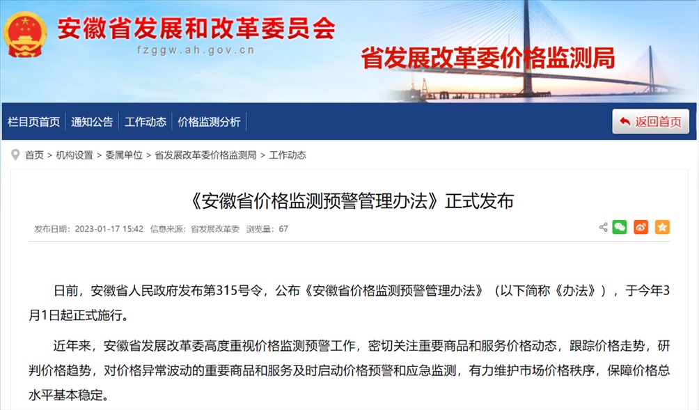 《安徽省價格監(jiān)測預(yù)警管理辦法》。圖片來源:安徽省發(fā)展和改革委員會