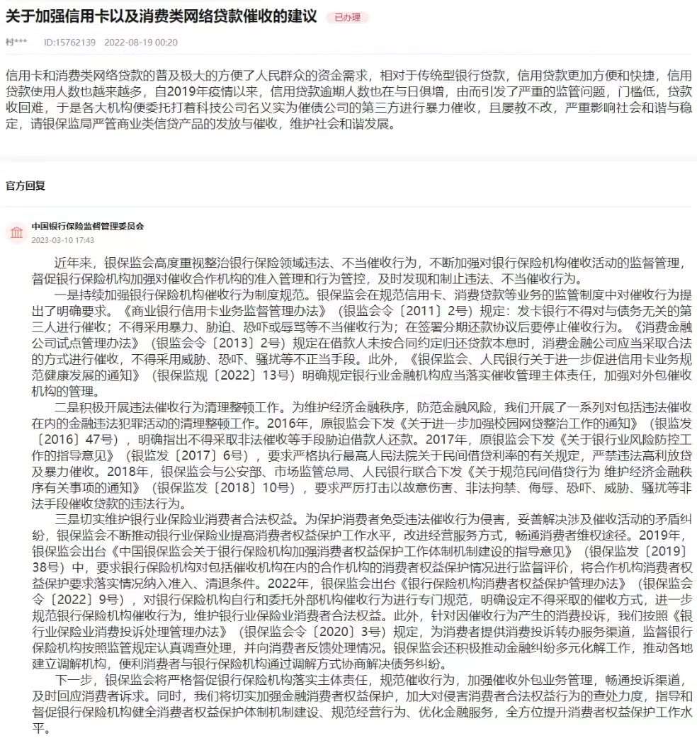 銀保監(jiān)會(huì)在回復(fù)中表示,近年來(lái),銀保監(jiān)會(huì)高度重視整治銀行保險(xiǎn)領(lǐng)域違法、不當(dāng)催收行為,不斷加強(qiáng)對(duì)銀行保險(xiǎn)機(jī)構(gòu)催收活動(dòng)的監(jiān)督管理,督促銀行保險(xiǎn)機(jī)構(gòu)加強(qiáng)對(duì)催收合作機(jī)構(gòu)的準(zhǔn)入管理和行為管控,及時(shí)發(fā)現(xiàn)和制止違法、不當(dāng)催收行為。