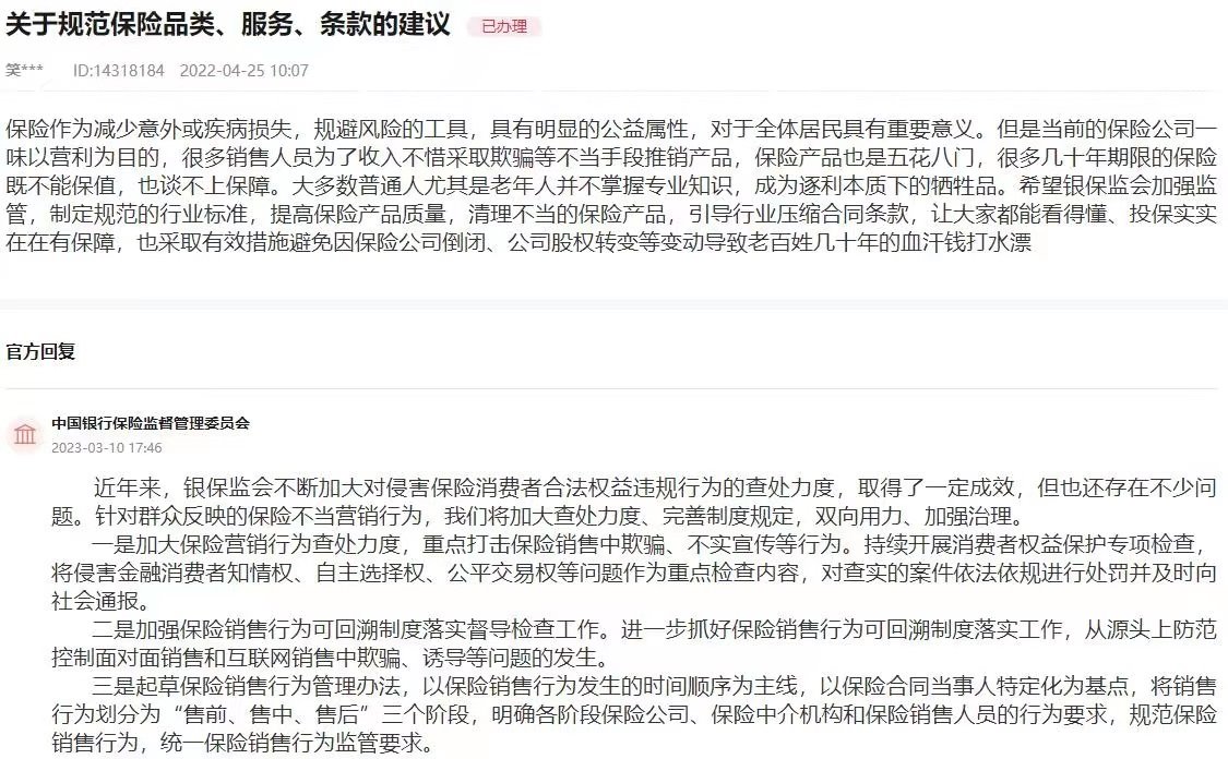 “近年來(lái),銀保監(jiān)會(huì)不斷加大對(duì)侵害保險(xiǎn)消費(fèi)者合法權(quán)益違規(guī)行為的查處力度,取得了一定成效,但也還存在不少問(wèn)題?!便y保監(jiān)會(huì)在回復(fù)中表示,針對(duì)群眾反映的保險(xiǎn)不當(dāng)營(yíng)銷(xiāo)行為,將加大查處力度、完善制度規(guī)定,雙向用力、加強(qiáng)治理。