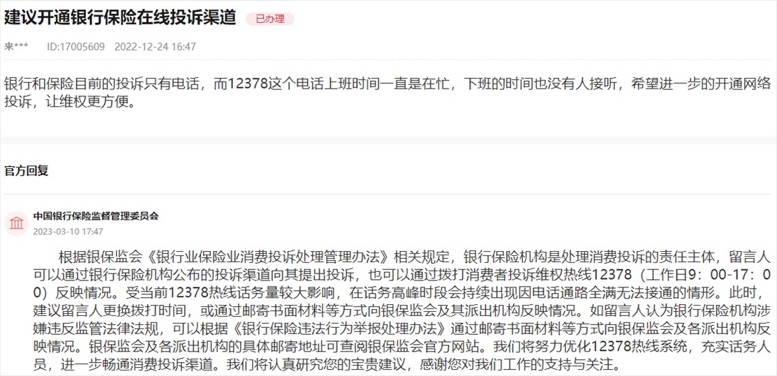 針對(duì)網(wǎng)友提出的“建議開(kāi)通銀行保險(xiǎn)在線投訴渠道”,銀保監(jiān)會(huì)在回復(fù)中表示,將努力優(yōu)化消費(fèi)者投訴維權(quán)熱線12378系統(tǒng),充實(shí)話務(wù)人員,進(jìn)一步暢通消費(fèi)投訴渠道。