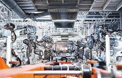 焊裝機(jī)器人在吉林長春中國第一汽車集團(tuán)有限公司焊裝車間內(nèi)焊接車身