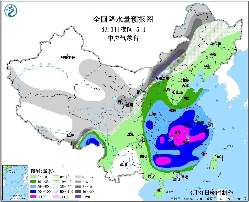 4月1日夜間至5日,甘肅東部、寧夏、河北北部和內(nèi)蒙古中東部等地有中到大雪或雨夾雪,內(nèi)蒙古中部等地局地暴雪或大暴雪,主要降雪時(shí)段為2日至3日;西北地區(qū)東南部、西南地區(qū)東部、江漢、江淮、江南、華南以及黃淮等地有中到大雨,其中河南東南部、湖北東部、湖南、安徽、江西、浙江西部、廣西北部、廣東北部和福建西部等地的部分地區(qū)有暴雨,局地大暴雨;主要降水時(shí)段為2日至4日。上述地區(qū)累計(jì)降水量20-50毫米,部分地區(qū)有70-120毫米,局地可達(dá)160毫米;100毫米以上降雨覆蓋面積達(dá)23萬平方公里。江淮及以南地區(qū)伴有短時(shí)強(qiáng)降水、雷暴大風(fēng)或冰雹等強(qiáng)對(duì)流天氣,最大小時(shí)降水量30-60毫米;江南北部、江漢東部、江淮等地伴有10級(jí)以上雷暴大風(fēng)。