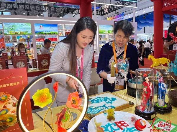 “我們的糖人制作技藝興于清朝道光年間,技法分為吹、塑、畫。結(jié)合消費新需求,我們推出了一些新產(chǎn)品,很受年輕人喜歡。在消博會上,通過展示糖人技藝,讓更多的消費者了解傳統(tǒng)文化,喜歡上我們的作品?!鄙蜿柪钍咸侨酥谱骷妓嚨谖宕鷤鞒腥死铠P艷表示。