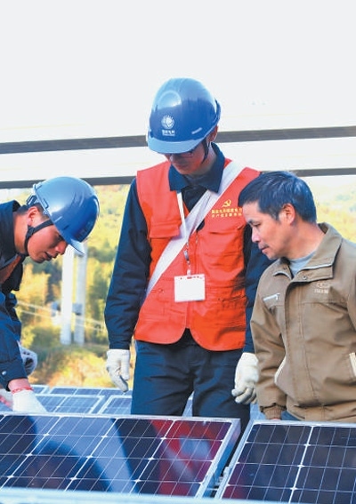 國(guó)網(wǎng)福建省電力公司員工幫助用戶(hù)檢查光伏發(fā)電板。鄭 極攝