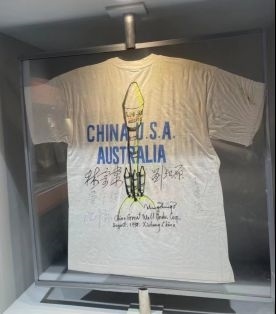 再給大家推薦一個不容錯過的“打卡點(diǎn)”:澳星發(fā)射成功紀(jì)念T恤。這件T恤全部都是著名航天老專家們的“親簽”:林宗棠(時任航空航天部部長)、劉紀(jì)原(時任航空航天部副部長)、沈辛蓀(時任中國運(yùn)載火箭研究院院長)、王德臣(時任長二E火箭總設(shè)計師)、屠守鍔(時任長二E火箭技術(shù)總顧問)等。在紀(jì)念T恤的C位,還有劉竹生院士親筆畫的長征二號E運(yùn)載火箭(即“長二捆”火箭)的漫畫圖??芍^眾“星”云集,珍貴程度可想而知。