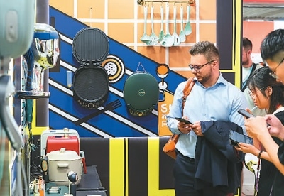 第133屆廣交會,主辦方專門在客流量最大的展館主通道區(qū)域設置了一批中國工業(yè)設計展位。圖為境外采購商正在了解一家中國工業(yè)設計企業(yè)的廚房電器產(chǎn)品。新華社記者 劉大偉攝