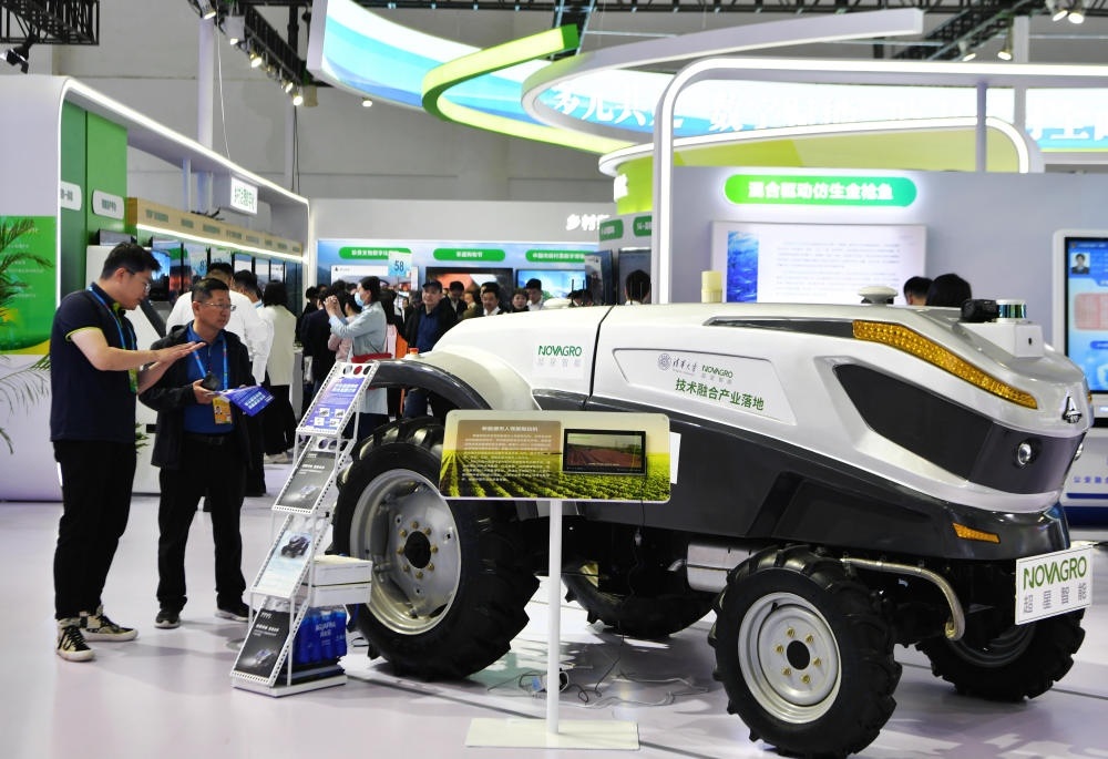 在第六屆數(shù)字中國建設(shè)峰會(huì)智慧農(nóng)業(yè)展廳展出的新能源無人駕駛智能拖拉機(jī)吸引參觀者駐足觀看(4月26日攝)。新華社記者 魏培全 攝
