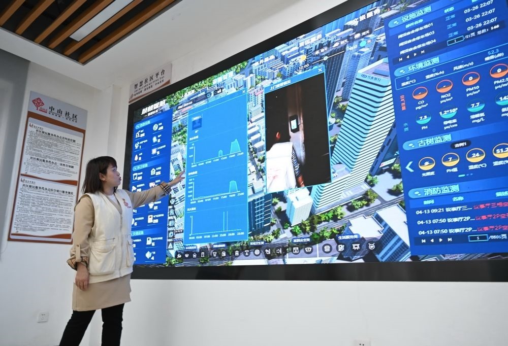 福州市鼓樓區(qū)是國家智能社會(huì)治理綜合實(shí)驗(yàn)基地,社區(qū)工作者林英在鼓樓區(qū)鼓東街道中山社區(qū)介紹“智慧社區(qū)”建設(shè)提升基層治理能力情況(4月25日攝)。新華社記者 林善傳 攝