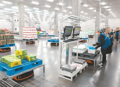 2月27日,在湖北省襄陽(yáng)市好鄰居生鮮物流中心,機(jī)器人根據(jù)工作人員指令穿梭于貨架之間,自動(dòng)分揀蔬菜、水果等生鮮產(chǎn)品。楊 東攝(人民視覺(jué))