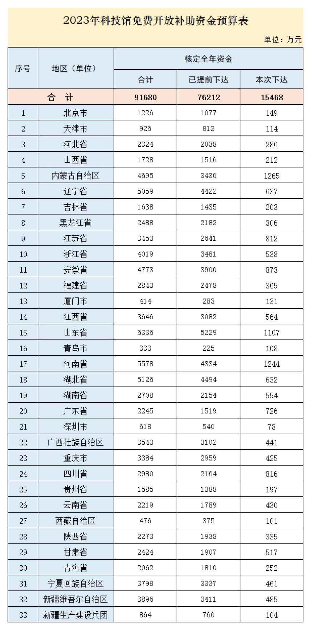 人民網北京5月10日電 (記者任妍)記者從財政部獲悉,為保障免費開放科技館正常運轉,經研究,現下達2023年科技館免費開放補助資金預算,統籌用于各省(區(qū)、市)及新疆生產建設兵團2023年免費開放科技館門票減收補助、運行保障增量補助及展品更新補助等方面。數據顯示,全國核定預算91680萬元,提前下達76212萬元,此次下達15468萬元。