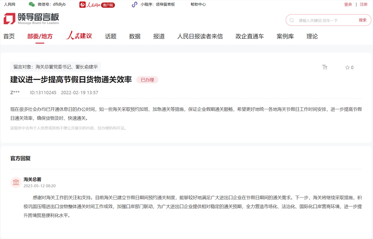 近日,網友通過人民網“領導留言板”對全國海關積極建言獻策,包括外來物種入侵、進一步提高節(jié)假日貨物通關效率等方面。