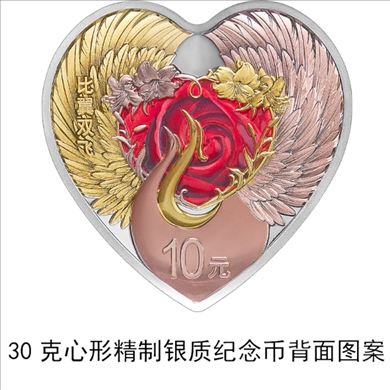 30克心形銀質(zhì)“比翼雙飛”紀念幣背面圖案為雙鳥、玫瑰、百合等裝飾組合圖案,并刊“比翼雙飛”字樣及面額。