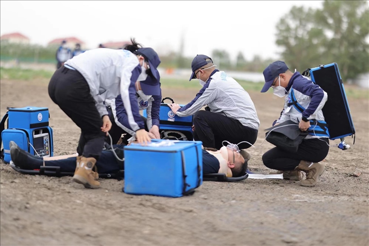 他們首先將模擬航天員抬到鏟式擔(dān)架上,迅速作出病情判斷后,立即護(hù)送進(jìn)入救護(hù)直升機(jī)??紫殄|發(fā)出指令,趙琳輸送氧氣,朱明開始心電監(jiān)測,高曉佩建立靜脈通道……。經(jīng)初步驗(yàn)傷,按照原定救治程序展開急救……演習(xí)于第二天上午10時(shí)結(jié)束,返回駐地,大家立刻顧不上休整,又迅速對(duì)演練進(jìn)行復(fù)盤。
