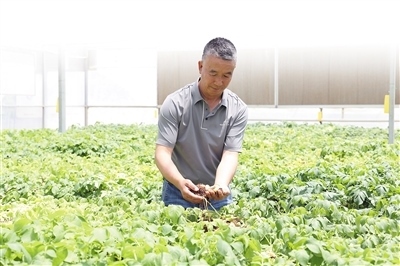 定西馬鈴薯研究所負(fù)責(zé)人李進(jìn)福在查看馬鈴薯原原種長(zhǎng)勢(shì)。本報(bào)記者 王錦濤攝