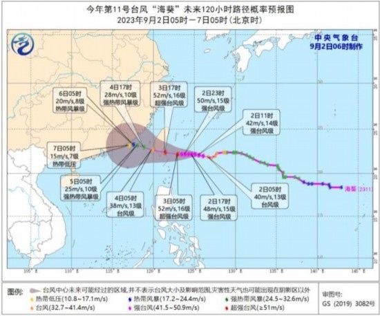 9月2日08時至3日08時,受“蘇拉”影響,南海西北部、北部灣東部、瓊州海峽及廣東沿海、廣西南部沿海、珠江口以及香港和澳門等地將有7-9級、陣風10-11級的大風,“蘇拉”中心經過的附近海面或地區(qū)風力有12-13級、陣風14-15級;受“??庇绊?,臺灣海峽、浙江南部沿海、福建沿海、廣東東部沿海、臺灣島沿海將有6-7級,陣風8級大風,臺灣以東洋面部分海域風力可達8-10級,陣風11-12級,“海葵”中心經過的附近海面風力可達12-13級,陣風14級。