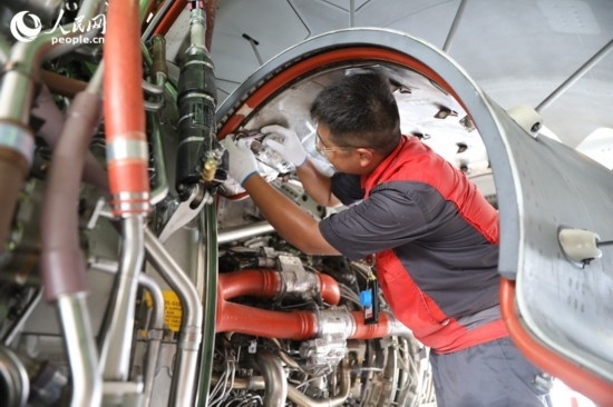 技術人員對飛機進行維修。 人民網(wǎng)記者 孟凡盛攝