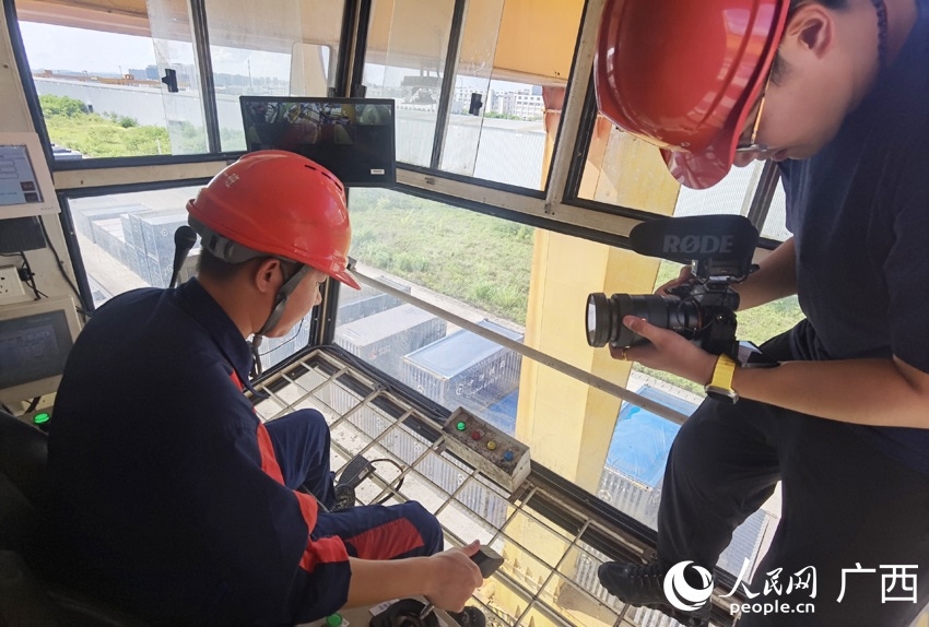記者在防城港企沙港區(qū)赤沙作業(yè)區(qū)采訪。人民網(wǎng) 朱曉玲攝