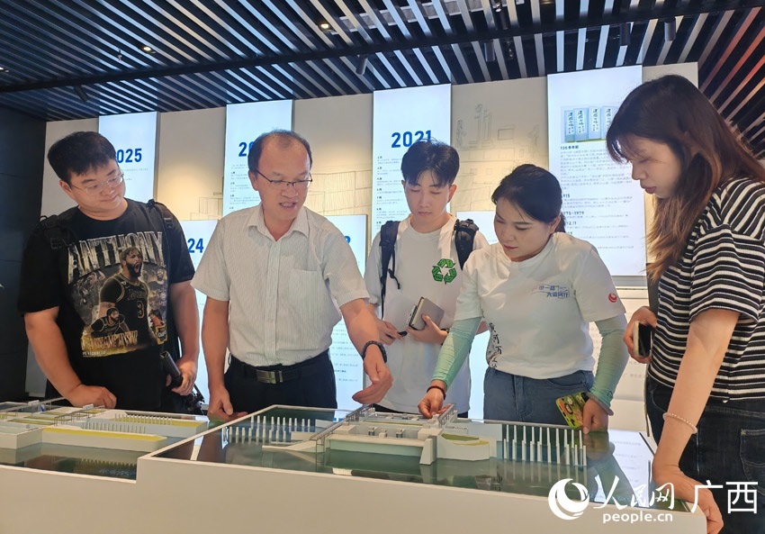 采訪團在西部陸海新通道南寧國際鐵路港展廳內(nèi)采訪。人民網(wǎng) 嚴(yán)立政攝