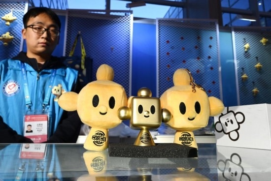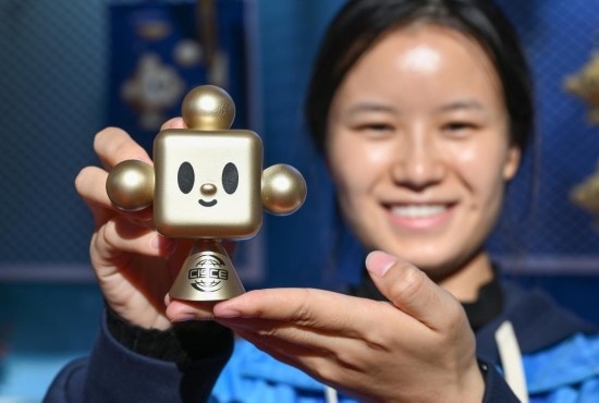 11月29日,在鏈博會文創(chuàng)小店服務的志愿者向記者展示 “鏈氪”玩具手辦。