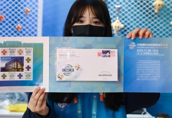 11月29日,一名在鏈博會文創(chuàng)小店服務的志愿者向記者展示帶有“鏈氪”形象的鏈博會專屬紀念郵折。