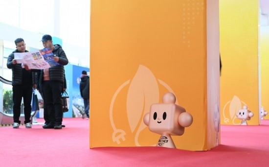 11月29日,鏈博會展廳入口處擺放著帶有“鏈氪”形象的小花壇引導觀展人群。