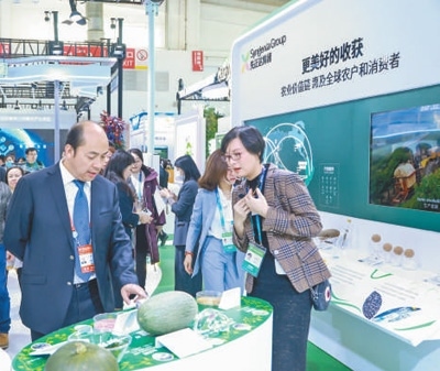 觀眾(左)在先正達(dá)集團(tuán)展臺參觀。本報記者 白真智攝