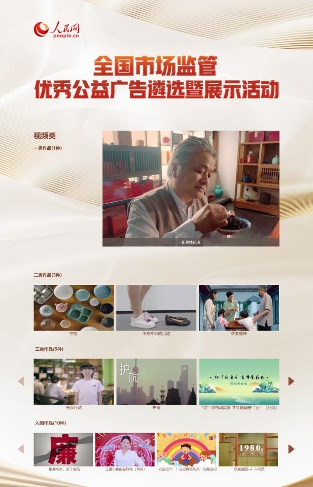 人民網北京12月17日電 (記者許維娜)公益廣告是弘揚社會主義核心價值觀的重要載體,也是促進市場監(jiān)管文化建設的重要力量。15日下午,全國市場監(jiān)管優(yōu)秀公益廣告遴選暨展示活動評審結果在北京揭曉。此次活動共評選出視頻類和平面類入選作品各19件,其中一類作品各有1件,二類作品各有3件,三類作品各有5件,入圍作品各有10件。