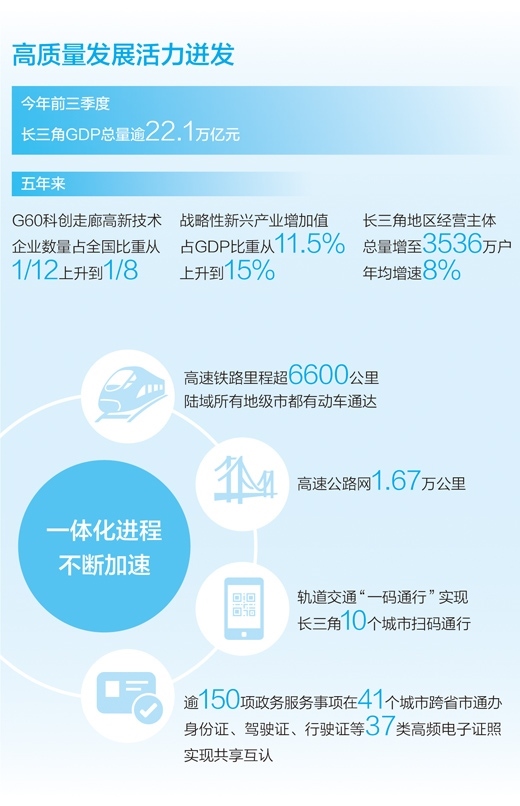 今年前三季度,長(zhǎng)三角GDP總量逾22.1萬億元,占全國GDP總量比重較2022年同期有所提升,三省一市經(jīng)濟(jì)增速均超過了全國平均水平;作為長(zhǎng)三角一體化發(fā)展國家戰(zhàn)略的先手棋和突破口,長(zhǎng)三角生態(tài)綠色一體化發(fā)展示范區(qū)掛牌以來,共形成136項(xiàng)務(wù)實(shí)有效的制度創(chuàng)新成果,其中38項(xiàng)已面向全國復(fù)制推廣;已有逾150項(xiàng)政務(wù)服務(wù)事項(xiàng)可在長(zhǎng)三角41個(gè)城市跨省市通辦,實(shí)現(xiàn)身份證、駕駛證、行駛證等37類高頻電子證照的共享互認(rèn)……